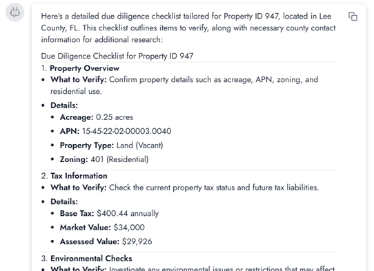 Due diligence is the process of researching and verifying all key details about a property before you close and become its owner. While you should always work with a local real estate professional, title attorney, or closing company, the tools inside Investment Dominator 2.0 like the AI Copilot can greatly assist you in digging deeper into the details of the property and area. Think of these tools as working alongside you and your closing agent: they generate custom checklists and reports, provide insights and county contact details, highlight risks, and suggest exit strategies — all so you can move toward closing with confidence and with as much information as possible about the property and market at your fingertips.