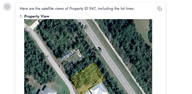 - A satellite view with lot lines by entering in something like “Can you show me the satellite view of this property with the lot lines so I can see what it looks like?”: