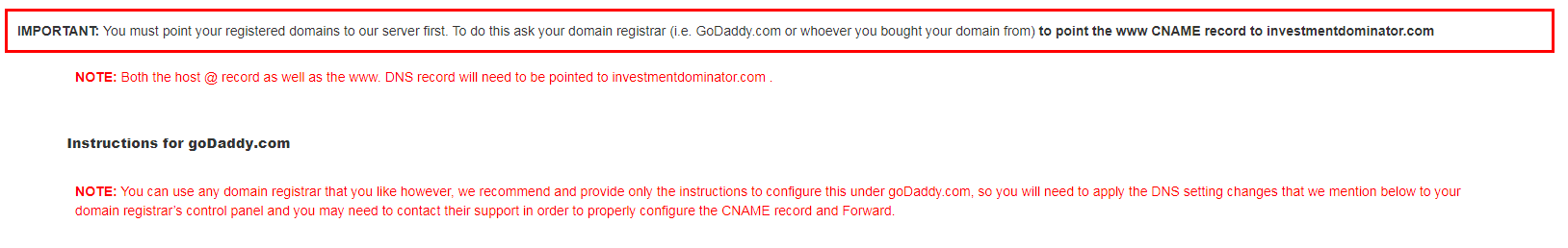 Therefore many users, register their own custom domains from a domain registrar like GoDaddy.com and then point that domain to their Investment Dominator account. In other words, when the person types in the custom domain that you purchased (i.e. www.YourDomain.com) it will send them to your buying, or selling site.