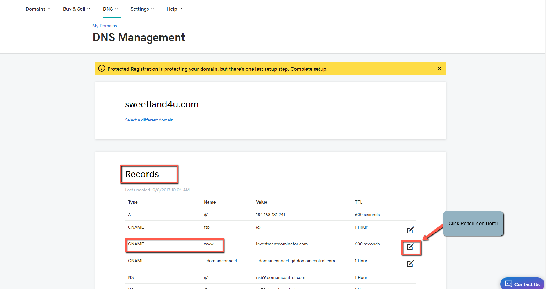 (pencil icon) next to CNAME (www) record as shown: