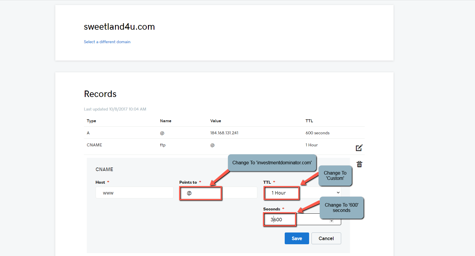 7. Change the ‘Points to’ value to investmentdominator.com, change ‘TTL’ to Custom and ‘Seconds’ to 600 as shown: