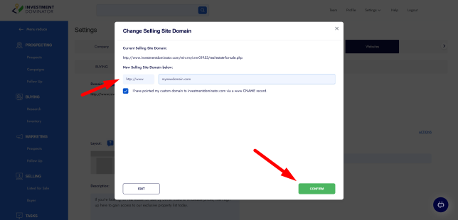 3. Enter your new domain under ‘New Selling Site Domain below’, check the ‘I have pointed my custom domain to investmentdominator.com via a www CNAME record’ option and then click the ‘Confirm‘ button, on the next screen review and confirm the change and your new domain will be saved.