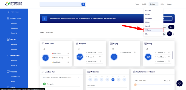 1. After you have pointed your domain(s) DNS to the correct IP Address, you can map your domains to your Investment Dominator CRM. To do this, log into your Investment Dominator app and go to ‘Settings > Website’ at the top.