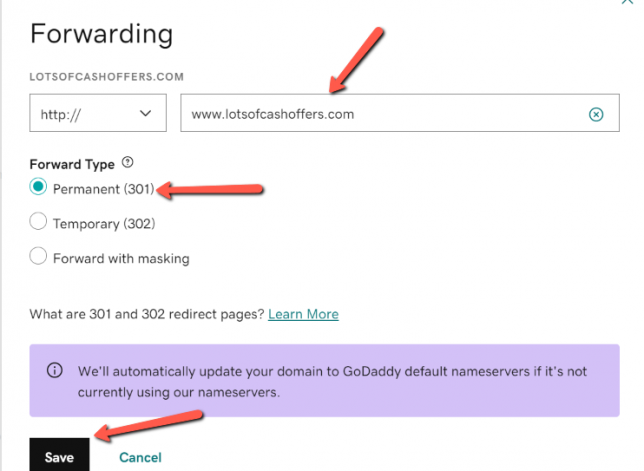 10. Enter in your custom domain starting with the www. in the blank text box to the under the FORWARD TO section.