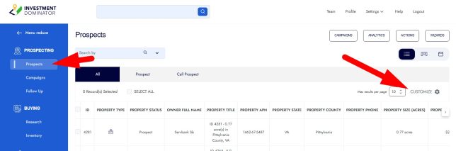 - Click the ‘CUSTOMIZE’ option to the top right of the record list: