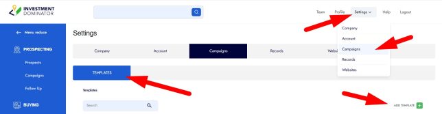 Step 1: Navigate to ‘Settings> Campaigns> TEMPLATES’ and click the ‘ADD TEMPLATE’ option: