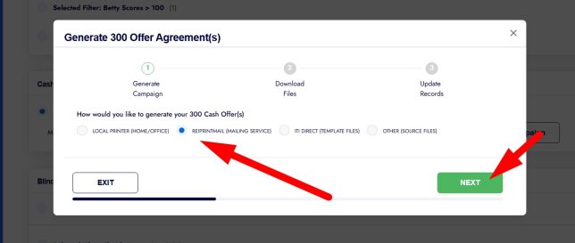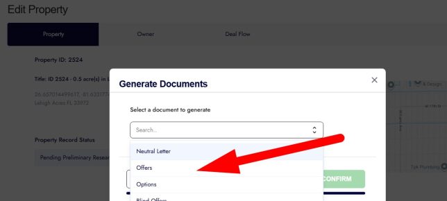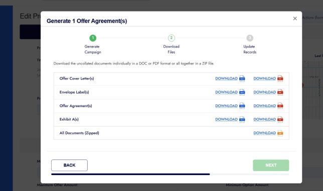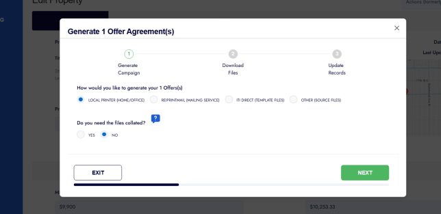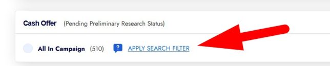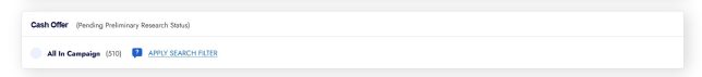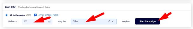 - Select ‘All In Campaign‘ to generate offers for all properties in ‘Pending Preliminary Research‘, or
