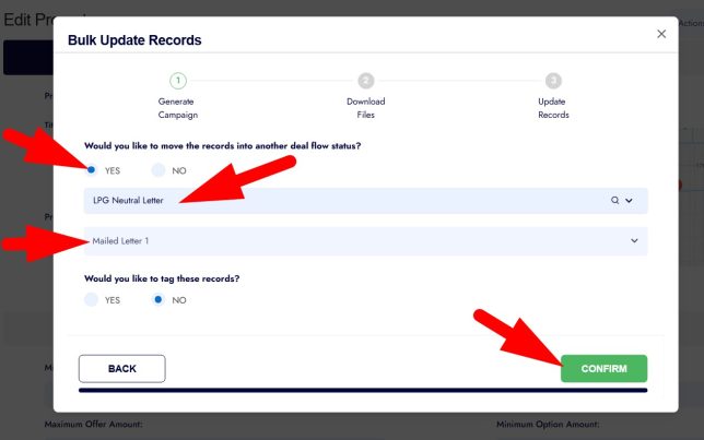 - Once you have downloaded all the files locally, click ‘NEXT‘ then let the system know if you would like to move this record to the next status in the Deal Flow and/or tag the records: