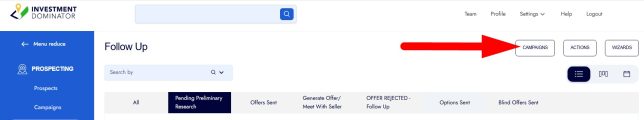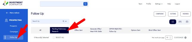- Ensure all target properties are set to the ‘Pending Preliminary Research‘ status so that you can pull them up under the ‘PROSPECTING> Follow Up> Pending Preliminary Research‘ tab: