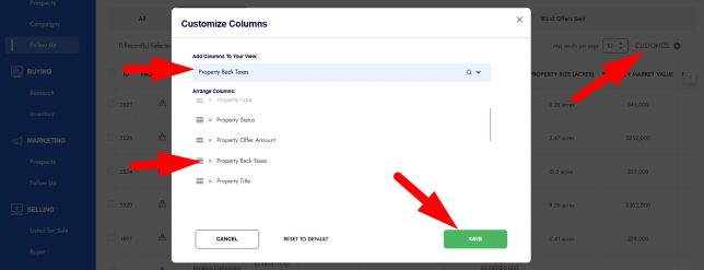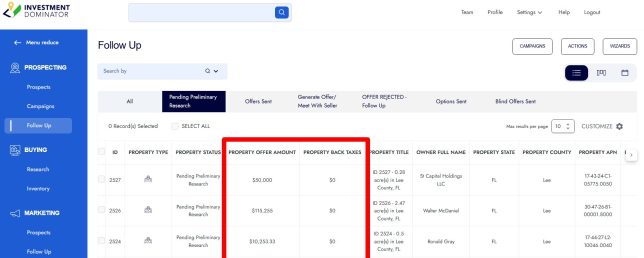 - Customize your view so that you have the ‘Property Offer Amount‘ and ‘Property Back Taxes‘ columns added to your table view and verify that at least the offer amounts and back taxes are filled out where applicable: