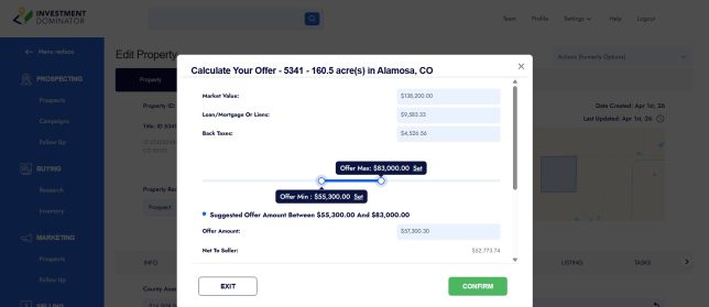 The Offer/ Option Calculator helps you quickly evaluate a property and set your offer and option amounts based on key financial data like market value and back taxes. It provides suggested values that you can adjust manually to fit your deal strategy.