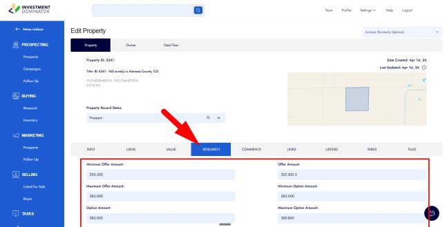 No, after clicking the ‘CONFIRM‘ button the values entered from the Offer/ Option Calculator all get stored in your property record under the ‘RESARCH‘ tab: