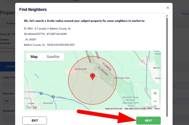 This will begin the process of identifying surrounding properties and their owners based on your subject property’s location.